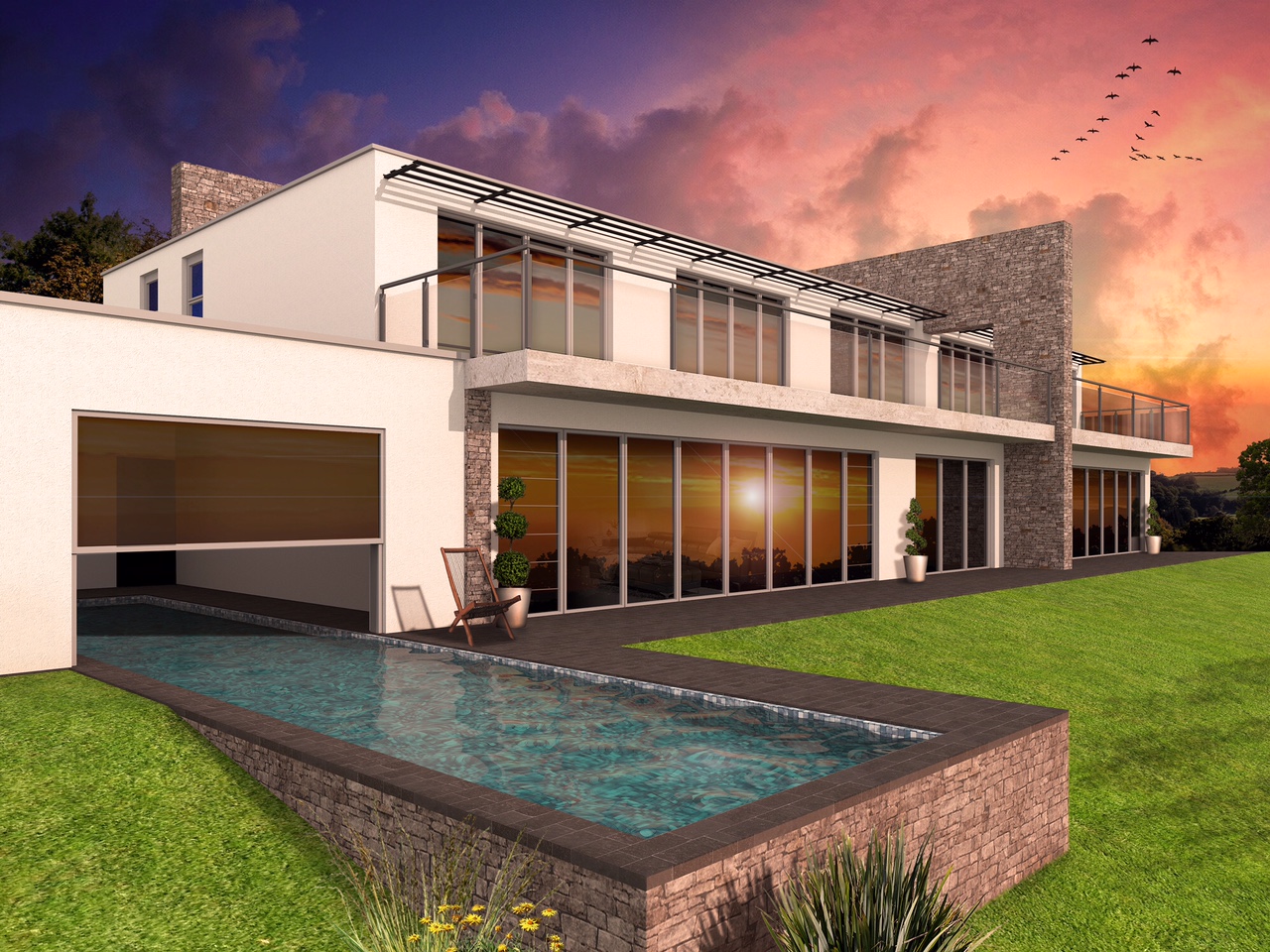The residential development consists of a large hill side dwelling with terraces and swimming pool.
